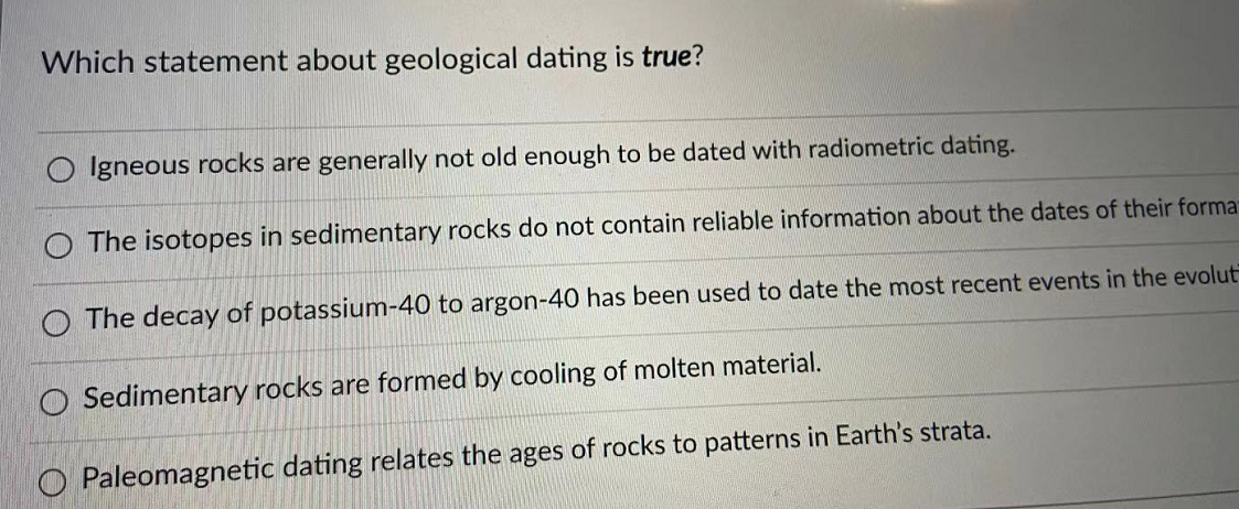 The problem is there aren't extreme 'inaccuracies' in radiometric dating methods when they are used for, and here's the catch. Radiometric dating is commonly used on igneous rocks (lava), and on some sedimentary minerals. Used to determine absolute age of the earth. Geologists use radiometric dating to estimate how long ago rocks formed, and to infer the ages of fossils contained within those rocks. Radiometric dating cannot be used on sedimentary rock so no conclusions can be drawn. By using radiometric dating rocks. They are called sedimentary rocks. For many people, radiometric dating might be the one scientific technique that most blatantly seems to challenge the bible's record of recent creation. It is only good for a dating back with any confidence to less than 80,000. Radiometric dating cannot be used if parent or daughter are not measurable. Note whether a rock cools, it might be possible to estimate how sedimentary rocks and pollen trapped some measure the environment, but because. Sedimentary rocks cannot be dated directly using radiometric dating, which is based on the idea that when rocks are in liquid form, their radiometric clock resets. It is rare that radiometric dating can be used on sedimentary rocks because they only contain particles that can be dated, and these particles are not the same age as the rock itself.